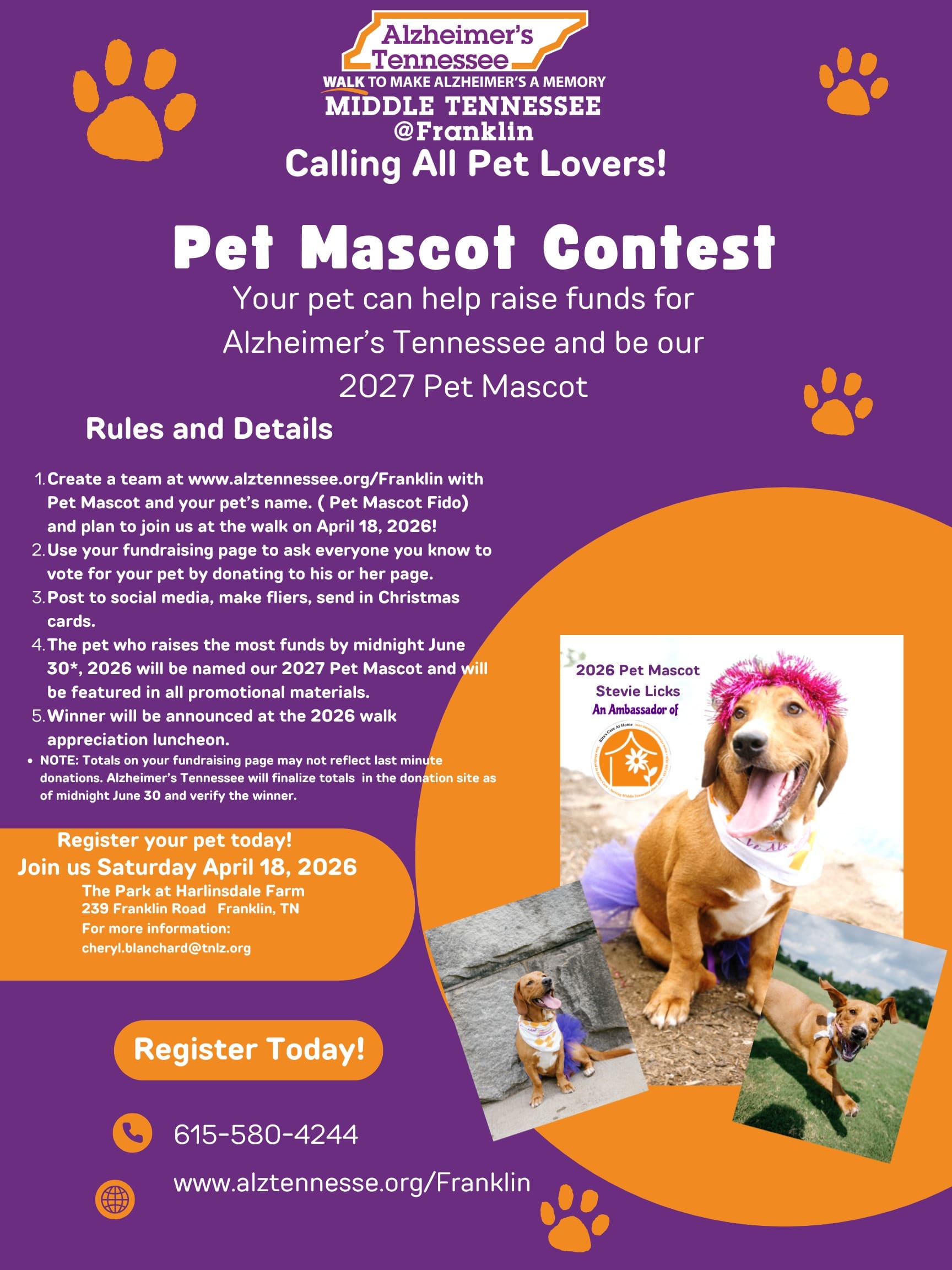 We are so proud to announce that our very own Miss Stevie Licks is the Official Pet Mascot for Alzheimer’s Middle Tennessee. Stevie raised the most money of any animal fronted team and therefore was crowned with the title. However, we are not done yet. Follow this link to get involved and raise some awareness and some money to help battle this awful disease.